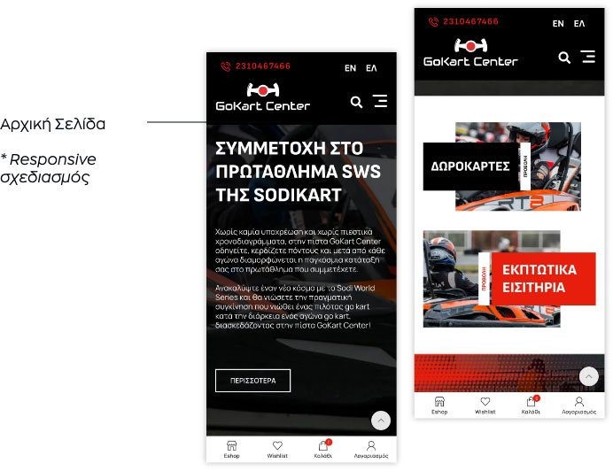 Η αρχική σελίδα αναπτύχθηκε με ενότητες που περιλαμβάνουν κατά σειρά προτεραιότητας όσα καλείται να κάνει ή να γνωρίζει ο χρήστης πριν επισκεφθεί την πίστα kart. Κείμενα προτροπής και κουμπιά αλληλεπίδρασης τον κατευθύνουν να πλοηγηθεί εύκολα προς τις εσωτερικές σελίδες. Οι προγραμματιστές μας, εξασφάλισαν την εύρυθμη λειτουργία και την άρτια προσαρμογή της ιστοσελίδας σε όλους τους τύπους οθόνης (η/υ, laptop, tablet, κινητό). Χάρη στις γνώσεις τους και την εμπειρία τους κατάφεραν να βελτιώσουν αισθητά την ταχύτητα απόκρισης του site, στοιχείο που συμβάλλει σημαντικά στην ευχάριστη εμπειρία του χρήστη, ιδίως όταν πρόκειται για eshop.