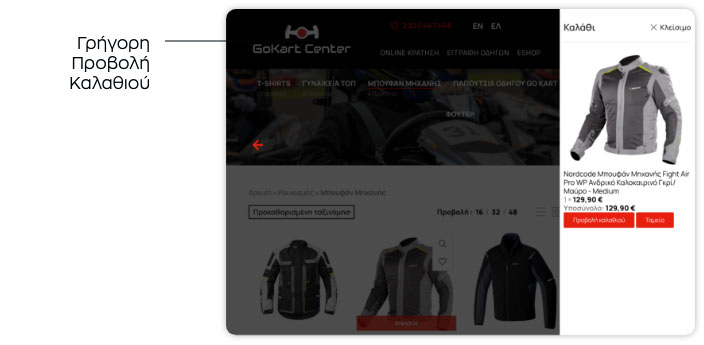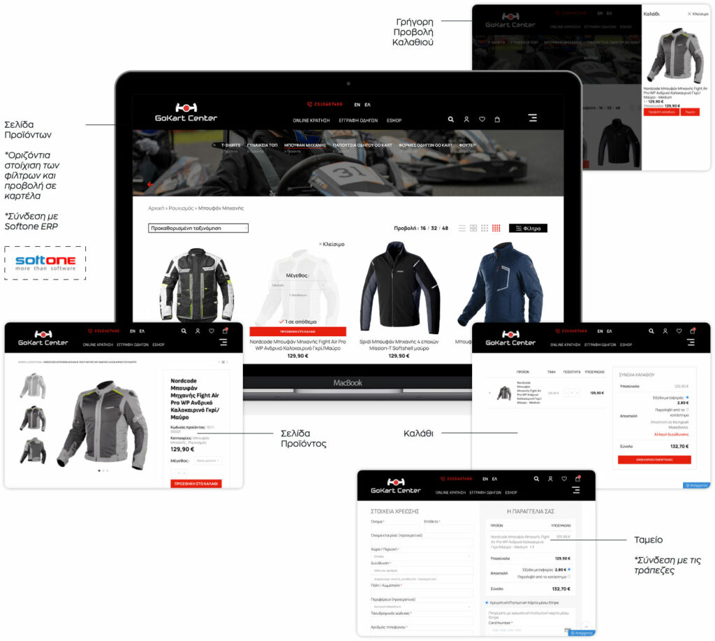 Περάσαμε όλα τα προϊόντα και υλοποιήθηκε γέφυρα του WooCommerce με το SoftOne για τον live συγχρονισμό των αποθεμάτων και των παραγγελιών. Από το menu, ο χρήστης μπορεί να ανοίξει την γρήγορη προβολή καλαθιού, χωρίς να χρειαστεί να φύγει από τη σελίδα που βρίσκεται. Επίσης, έχει τη δυνατότητα σύνδεσης στη σελίδα Καλάθι για να επεξεργαστεί τις παραγγελίες και στο Ταμείο για να ολοκληρώσει την αγορά. Πραγματοποιήσαμε την σύνδεση με τις τράπεζες, τις μεταφορικές εταιρίες, το skroutz και το bestprice για την ασφαλή και γρήγορη ολοκλήρωση των παραγγελιών. Eκπαιδεύσαμε κατάλληλα τον πελάτη για την αποτελεσματική διαχείριση του eshop του.