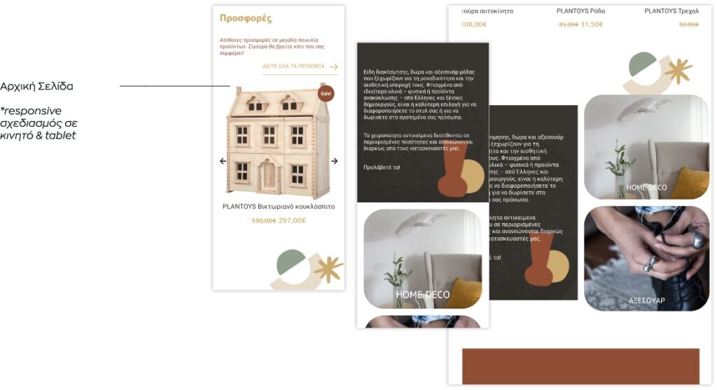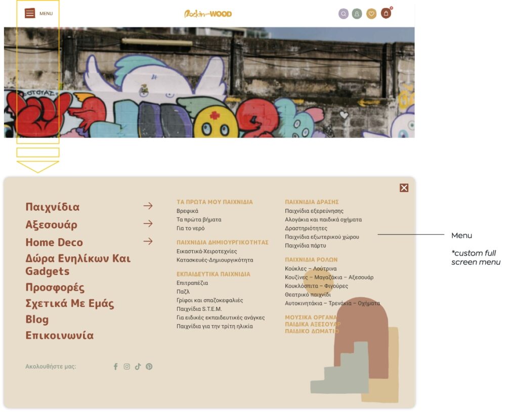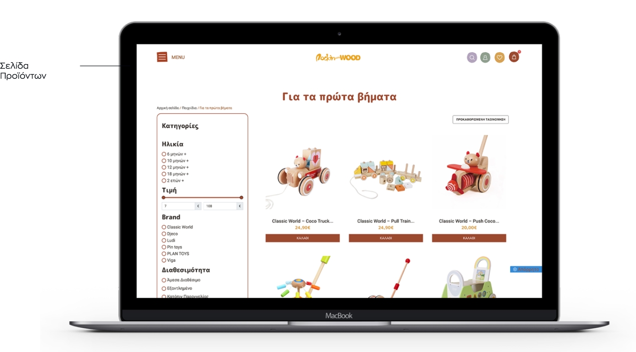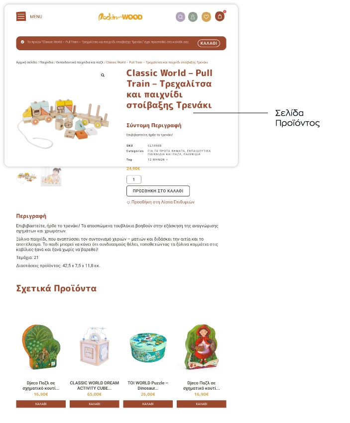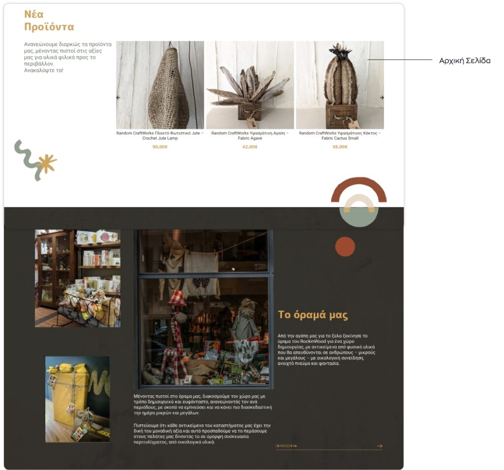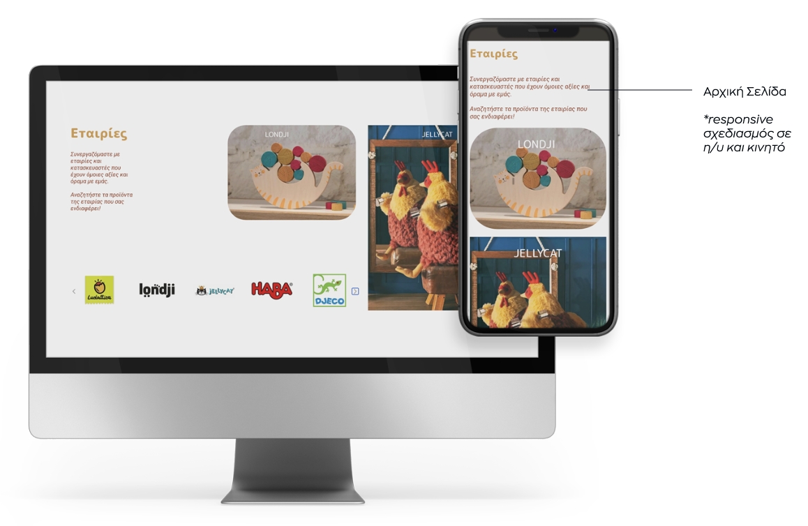 Συζητώντας με τον πελάτη μας και κατανοώντας το σκεπτικό και τις ανάγκες του, ανασχεδιάσαμε την ιστοσελίδα του διατηρώντας τα στοιχεία ενός εταιρικού site και ενσωματώνοντας τις λειτουργίες ενός eshop. Η αρχική σελίδα αναπτύχθηκε από ενότητες που να πληροφορούν τον χρήστη για τη φιλοσοφία και το όραμα του καταστήματος (την αγάπη τους για τα χειροποίητα αντικείμενα-παιχνίδια από ξύλο και άλλα φυσικά υλικά). Συμπληρώθηκε με την παρουσίαση προϊόντων ώστε να είναι άμεσα αντιληπτό από τον χρήστη τι είδους παιχνίδια διαθέτει το κατάστημα και με ποιες εταιρίες συνεργάζεται. Η ευρύτερη αισθητική της ιστοσελίδας διαμορφώθηκε με χρώματα, μοτίβα και φόρμες που παραπέμπουν στην μορφή των παιχνιδιών και την φύση των υλικών.
